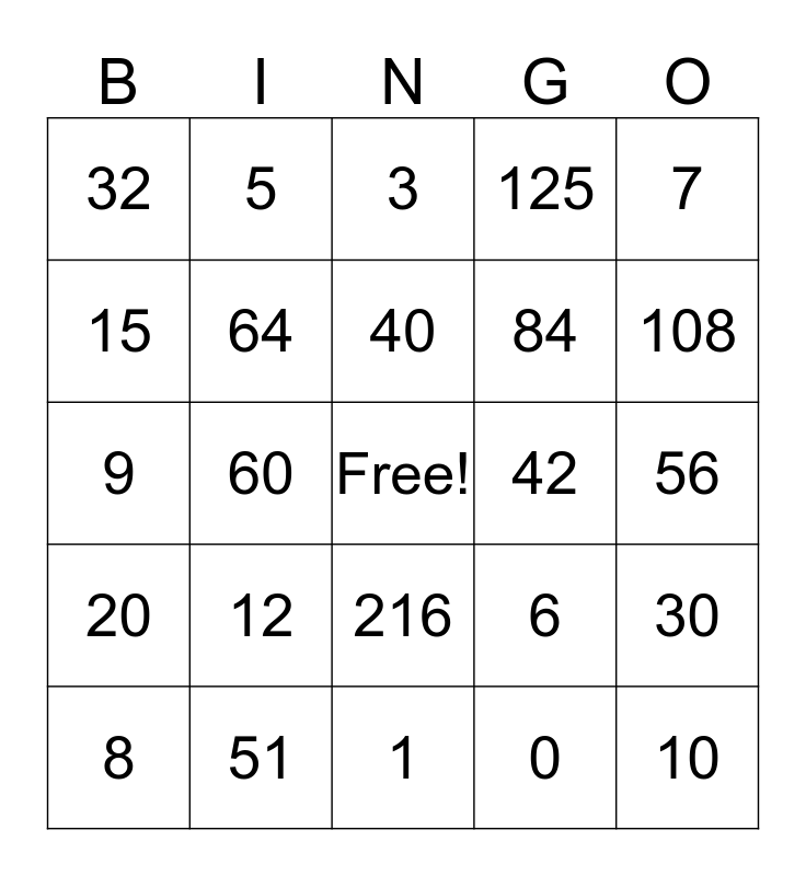 This bingo card has a free space and 34 words: 30, 0, 2, 72, 20, 64, 7, 8, 5, 27, 40, 3, 126, 4, 42, 108, 51, 9, 12, 6, 216, 54, 32, 56, 1, 10, 125, 11, 84, 15, 110, 60, 30 and 64.