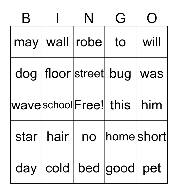 This bingo card has a free space and 54 words: hot, star, cat, is, no, bog, to, he, dog, play, may, like, cold, day, red, bed, pet, bug, into, him, home, are, this, will, green, wall, all, ran, the, good, all, over, trade, wash, robe, baby, wave, short, your, floor, see, sea, wild, long, hair, land, mother, have, street, school, was, time, of and us.
