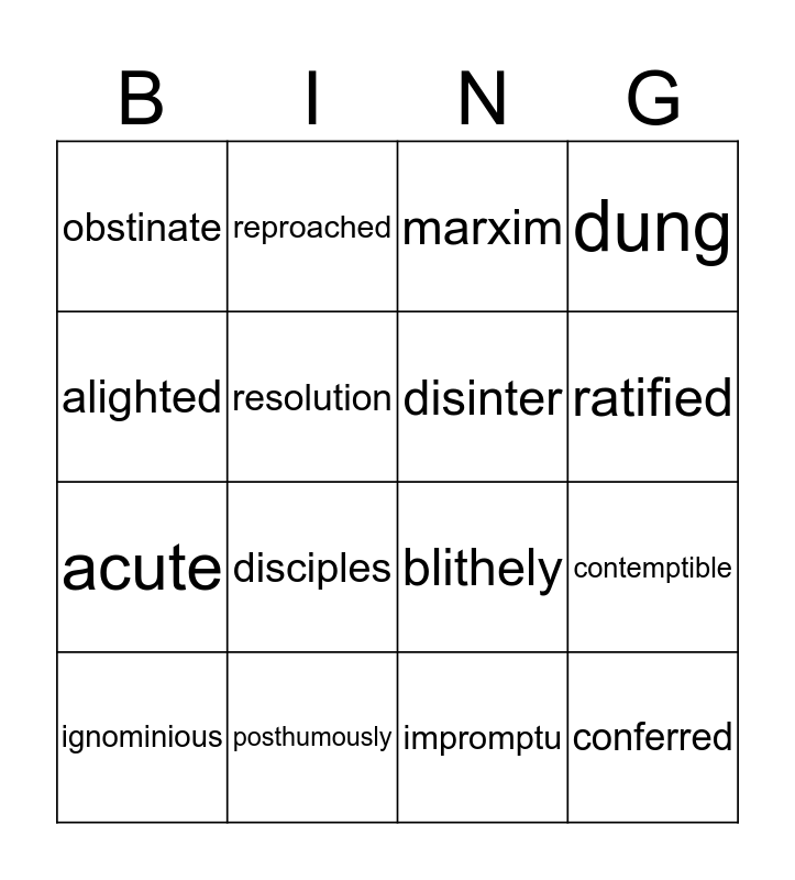 This bingo card has 40 words: articulate, blithely, bide, disinter, marshal, pretext, ratified, tactics, alighted, conferred, contemptible, dung, ignominious, impromptu, posthumously, prophecy, implements, obstinate, cryptic, marxim, parasitical, indefatigable, acute, resolution, benevolent, cynical, enmity, ensconced, scallery, regarded, trodden, capered, lurched, expounded, disciples, gamboled, lowing, maltreating, reproached and vivacious.