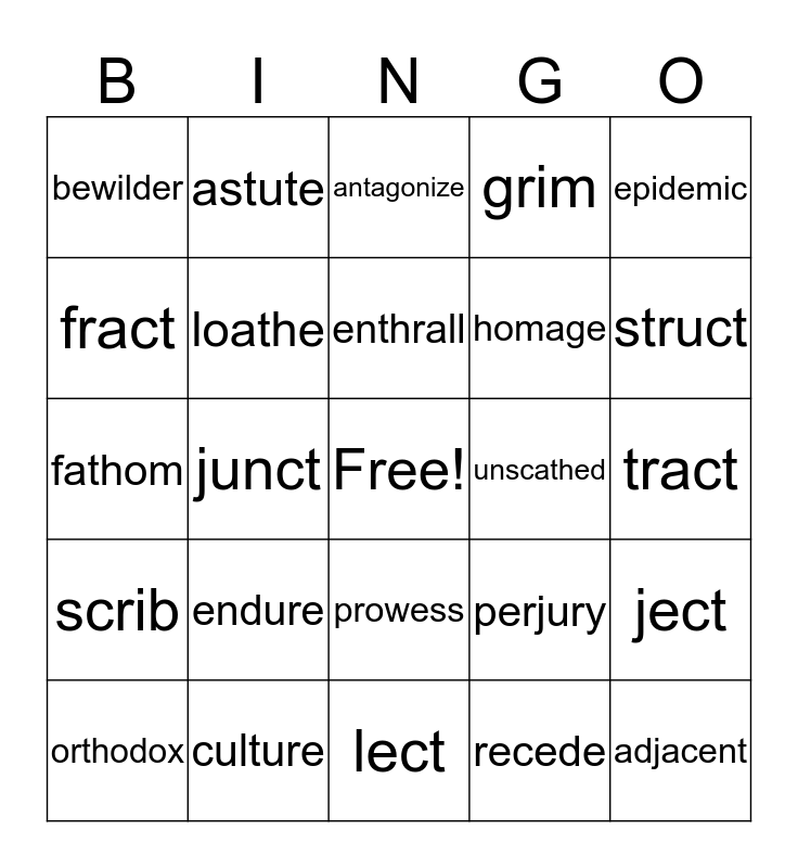 This bingo card has a free space and 24 words: endure, culture, enthrall, orthodox, epidemic, bewilder, fract, astute, unscathed, prowess, homage, fathom, perjury, ject, loathe, recede, tract, antagonize, struct, junct, adjacent, scrib, grim and lect.