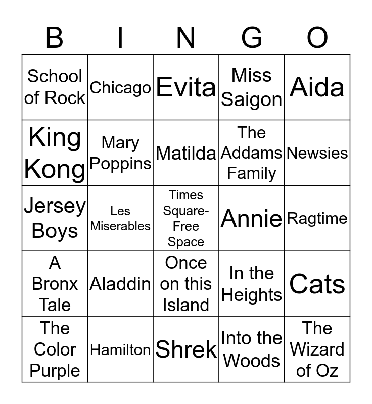 This bingo card has a free space and 54 words: Wicked, A Bronx Tale, Kinky Boots, Frozen, Once on this Island, Lion King, Miss Saigon, Come From Away, King Kong, Anastasia, School of Rock, Waitress, Hamilton, The Color Purple, Finding Neverland, Shrek, The Wizard of Oz, The Addams Family, A Little Princess, Ragtime, In the Heights, Seussical, Annie, Aida, The Secret Garden, Chicago, Phantom of the Opera, Pippin, Harry Potter and the Cursed Child, Into the Woods, Rent, Jesus Christ Superstar, West Side Story, Book of Mormon, Evita, Dreamgirls, Jersey Boys, Cats, Hairspray, Mary Poppins, Dear Evan Hansen, My Fair Lady, On Your Feet, Hunchback of Notre Dame, Aladdin, Mean Girls, Hadestown, The Band's Visit, Matilda, Les Miserables, Newsies, Fiddler on the Roof, The Sound of Music and Man of La Mancha.