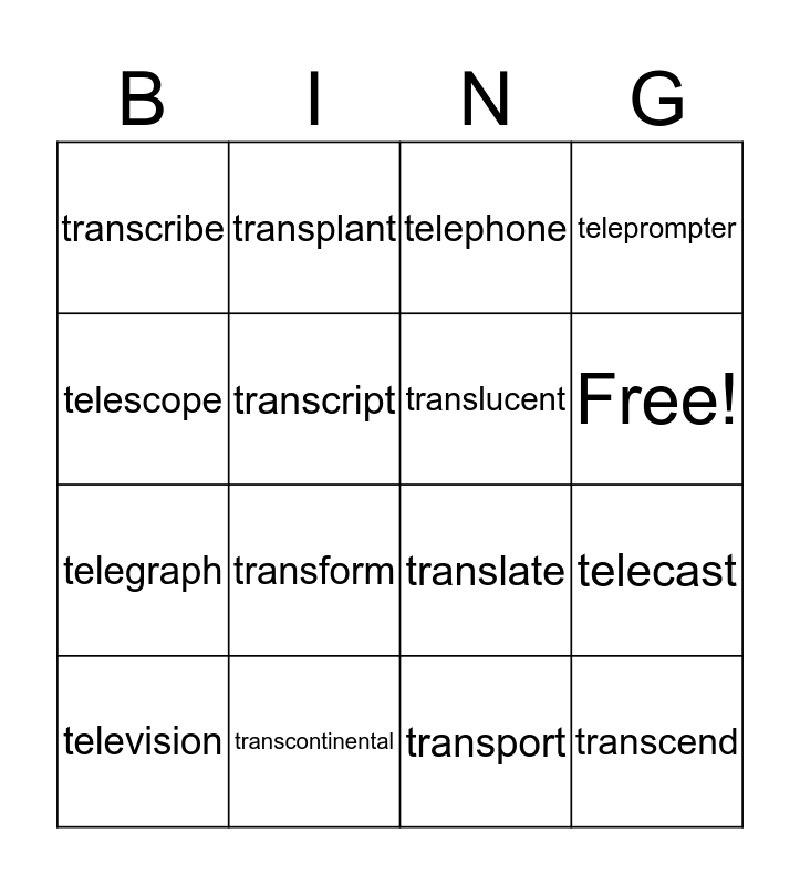 This bingo card has 18 words: transform, transcend, telephone, transcribe, translate, teleprompter, television, transplant, Free!, telegraph, transport, telescope, telecast, transcript, translucent, telecommute, transcontinental and transparent.