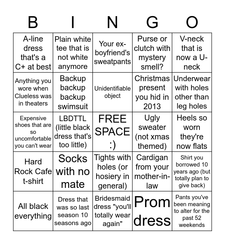 This bingo card has a free space and 24 words: Socks with no mate, Dress that was so last season 10 seasons ago, Unidentifiable object, All black everything, V-neck that is now a U-neck, A-line dress that's a C+ at best, Anything you wore when Clueless was in theaters, Plain white tee that is not white anymore, Ugly sweater (not xmas themed), Tights with holes (or hosiery in general), Christmas present you hid in 2013, Expensive shoes that are so uncomfortable you can't wear, Cardigan from your mother-in-law, Shirt you borrowed 10 years ago (but totally plan to give back), Backup backup backup swimsuit, Prom dress, Heels so worn they're now flats, Your ex-boyfriend's sweatpants, Underwear with holes other than leg holes, LBDTTL (little black dress that's too little), Pants you've been meaning to alter for the past 52 weekends, Hard Rock Cafe t-shirt, Purse or clutch with mystery smell? and Bridesmaid dress "you'll totally wear again".