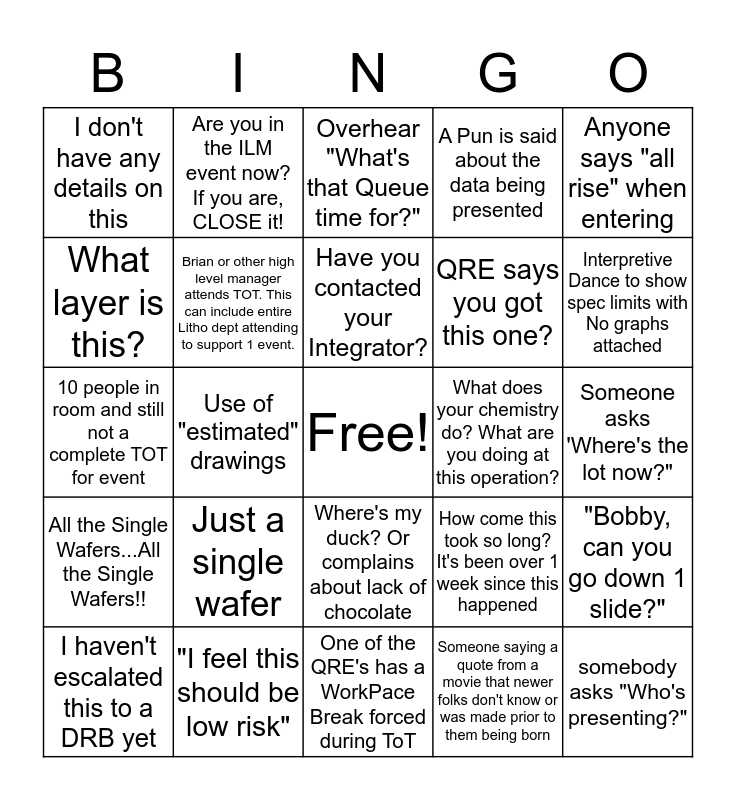 This bingo card has a free space and 24 words: Just a single wafer, "I feel this should be low risk", Have you contacted your Integrator?, I haven't escalated this to a DRB yet, Anyone says "all rise" when entering, I don't have any details on this, What layer is this?, Are you in the ILM event now? If you are, CLOSE it!, What does your chemistry do? What are you doing at this operation?, Where's my duck? Or complains about lack of chocolate, QRE says you got this one?, 10 people in room and still not a complete TOT for event, How come this took so long? It's been over 1 week since this happened, "Bobby, can you go down 1 slide?", Brian or other high level manager attends TOT. This can include entire Litho dept attending to support 1 event., Someone saying a quote from a movie that newer folks don't know or was made prior to them being born, Someone asks 'Where's the lot now?", Overhear "What's that Queue time for?", Interpretive Dance to show spec limits with No graphs attached, Use of "estimated" drawings, somebody asks "Who's presenting?", All the Single Wafers...All the Single Wafers!!, A Pun is said about the data being presented and One of the QRE's has a WorkPace Break forced during ToT.
