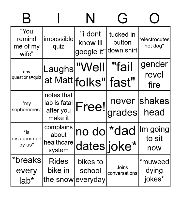 This bingo card has a free space and 24 words: complains about healthcare system, Rides bike in the snow, "Well folks", *breaks every lab*, *electrocutes hot dog*, "You remind me of my wife", any questions=quiz, impossible quiz, never grades, no do dates, "fail fast", "my sophomores", *dad joke*, Im going to sit now, Laughs at Matt, Joins conversations, shakes head, "i dont know ill google it", gender revel fire, notes that lab is fatal after you make it, *muweed dying jokes*, *is disappointed by us*, tucked in button down shirt and bikes to school everyday.