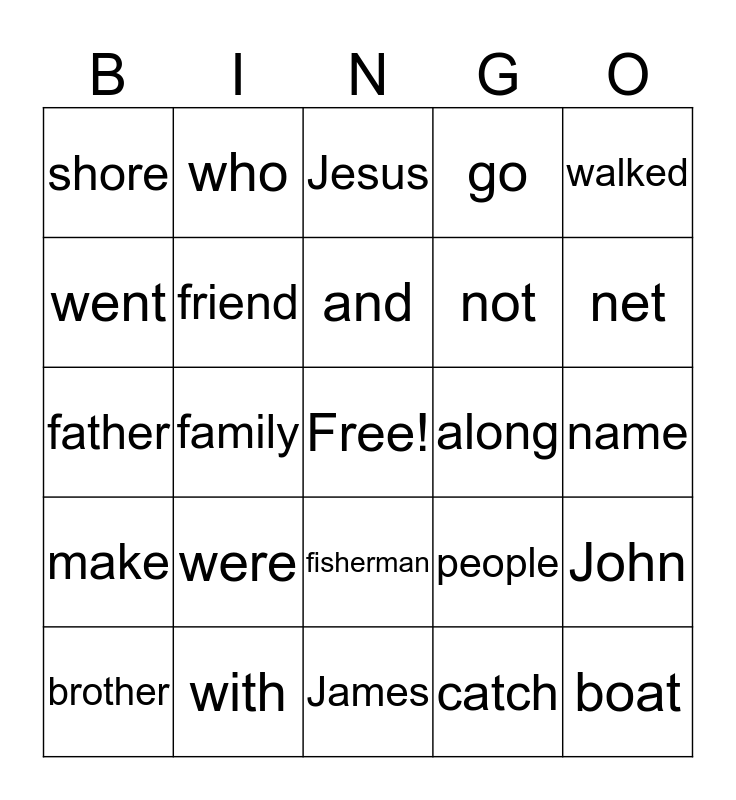 This bingo card has a free space and 29 words: brother, say, family, Andrew, shore, Jesus, friend, were, along, with, name, boat, James, catch, net, Simon, fisherman, make, walked, father, people, son, not, went, go, who, John, and and fish.