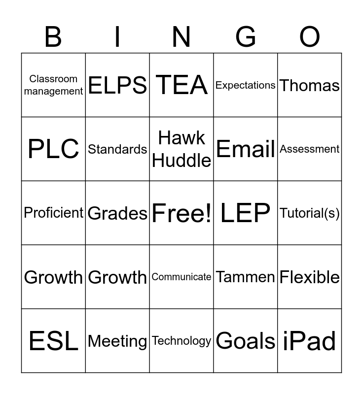 This bingo card has a free space and 28 words: Flexible, STAAR, Email, Goals, PLC, TEA, ELPS, Growth, LEP, ESL, Proficient, Expectations, Meeting, Technology, Assessment, Testing, Growth, Standards, Hawk Huddle, Communicate, Classroom management, Improve(ment), iPad, Grades, Tutorial(s), Tammen, Thomas and Anglin.