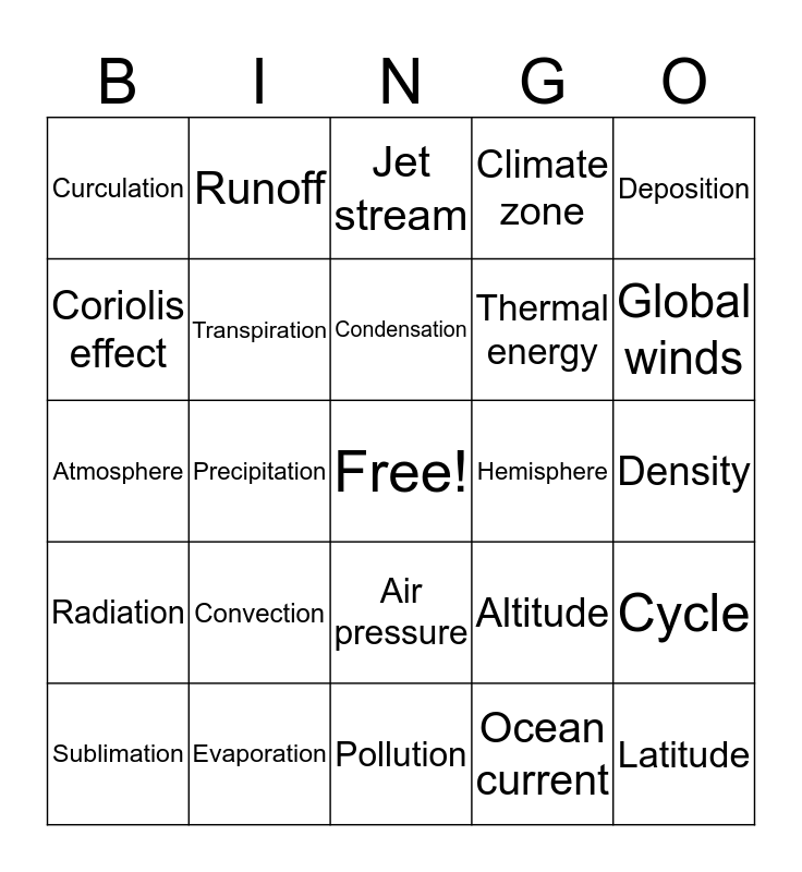 This bingo card has a free space and 24 words: Convection, Evaporation, Condensation, Sublimation, Deposition, Curculation, Coriolis effect, Runoff, Hemisphere, Air pressure, Thermal energy, Atmosphere, Altitude, Cycle, Transpiration, Ocean current, Density, Jet stream, Global winds, Precipitation, Latitude, Radiation, Climate zone and Pollution.