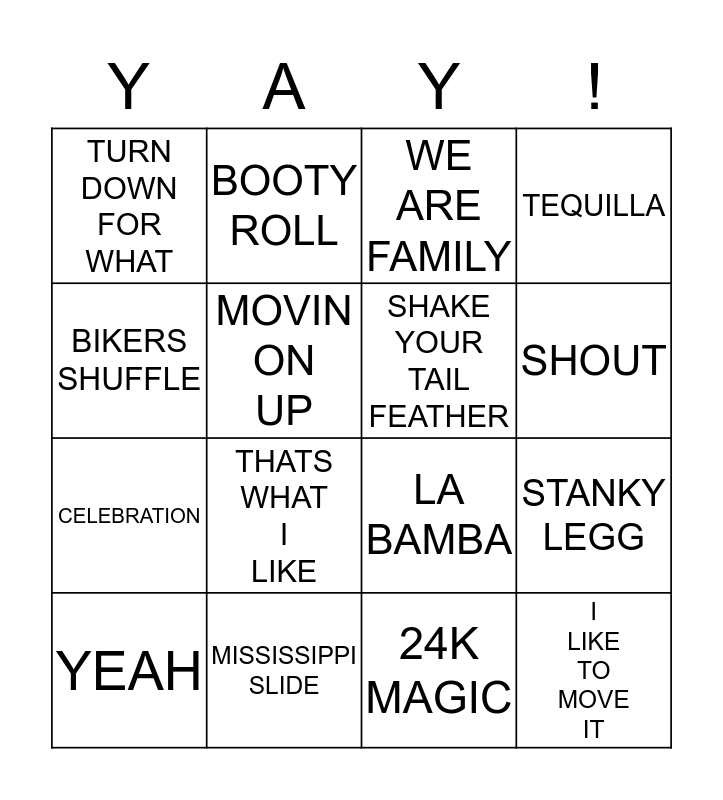 This bingo card has 17 words: 24K MAGIC, YEAH, WE ARE FAMILY, TURN DOWN FOR WHAT, THATS WHAT I LIKE, TEQUILLA, STANKY LEGG, SHAKE YOUR TAIL FEATHER, SHOUT, MOVIN ON UP, MISSISSIPPI SLIDE, LA BAMBA, BIKERS SHUFFLE, BOOTY ROLL, CELEBRATION, HAPPY and I LIKE TO MOVE IT.