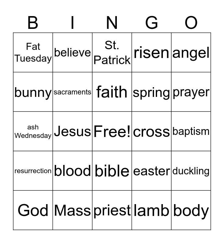 This bingo card has a free space and 29 words: God, Holy Spirit, Jesus, Mary, Fat Tuesday, St. Patrick, sacraments, blood, cross, Mass, baptism, body, priest, lamb, prayer, lent, bible, resurrection, angel, ash Wednesday, easter, holy water, spring, bunny, risen, believe, duckling, faith and Good Friday.