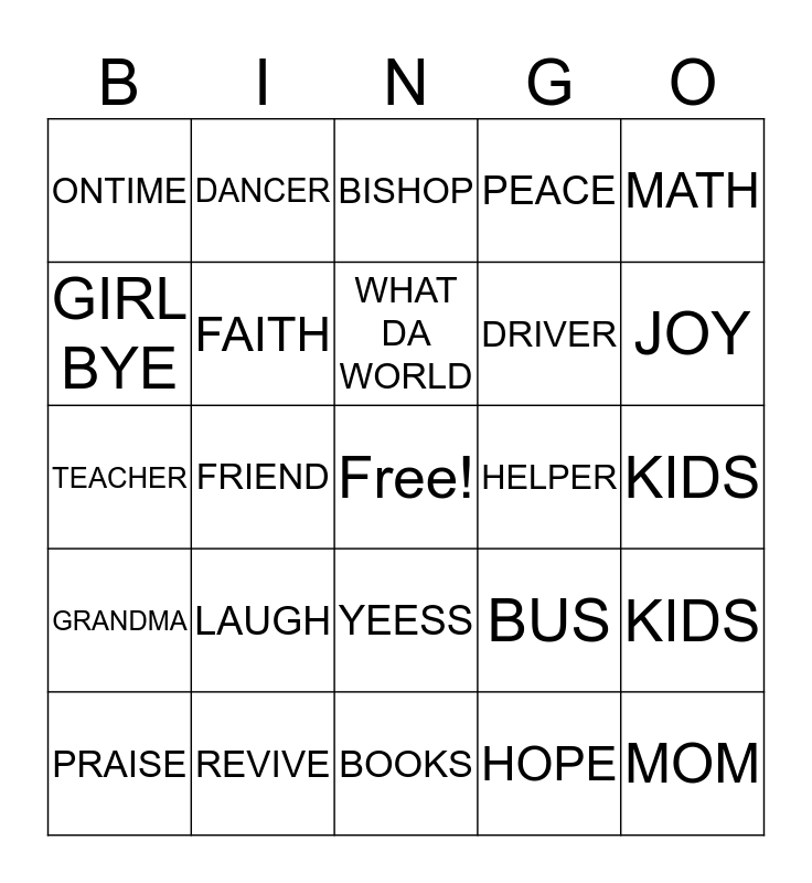This bingo card has a free space and 29 words: PRAISE, BFF, FRIEND, LOVE, ONTIME, BISHOP, FAITH, LAUGH, HELPER, REVIVE, KIDS, MOM, BOOKS, HOPE, JOY, EARLY, YEESS, GRANDMA, MATH, TEACHER, BUS, PATIENCE, DRIVER, GIRL BYE, PEACE, DANCER, KIDS, WHAT DA WORLD and SUNDAY.