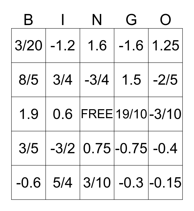 This bingo card has a free space and 25 words: -3/2, 3/10, -3/4, -0.6, 1.25, 3/20, 8/5, -1.2, 19/10, 0.75, 1.5, 1.9, -0.75, -0.4, 3/4, 6/5, -3/10, 1.6, -2/5, 0.6, -0.15, 5/4, 3/5, -1.6 and -0.3.