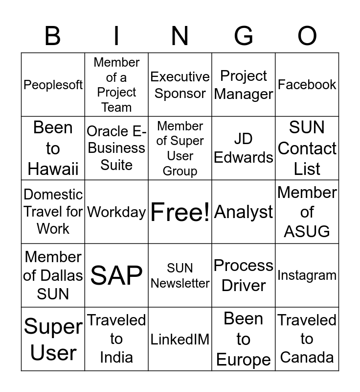 This bingo card has a free space and 24 words: SAP, Traveled to India, Member of Super User Group, Super User, Facebook, Peoplesoft, Been to Hawaii, Member of a Project Team, Analyst, SUN Newsletter, JD Edwards, Domestic Travel for Work, Process Driver, Instagram, Oracle E-Business Suite, Been to Europe, Member of ASUG, Executive Sponsor, SUN Contact List, Workday, Traveled to Canada, Member of Dallas SUN, Project Manager and LinkedIM.