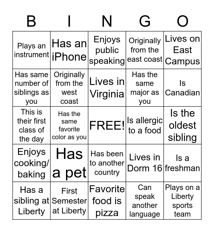 This bingo card has a free space and 24 words: Has a pet, First Semester at Liberty, Lives in Virginia, Has a sibling at Liberty, Lives on East Campus, Plays an instrument, Has same number of siblings as you, Has an iPhone, Is allergic to a food, Has been to another country, Has the same major as you, This is their first class of the day, Lives in Dorm 16, Is a freshman, Originally from the west coast, Can speak another language, Is the oldest sibling, Enjoys public speaking, Is Canadian, Has the same favorite color as you, Plays on a Liberty sports team, Enjoys cooking/ baking, Originally from the east coast and Favorite food is pizza.