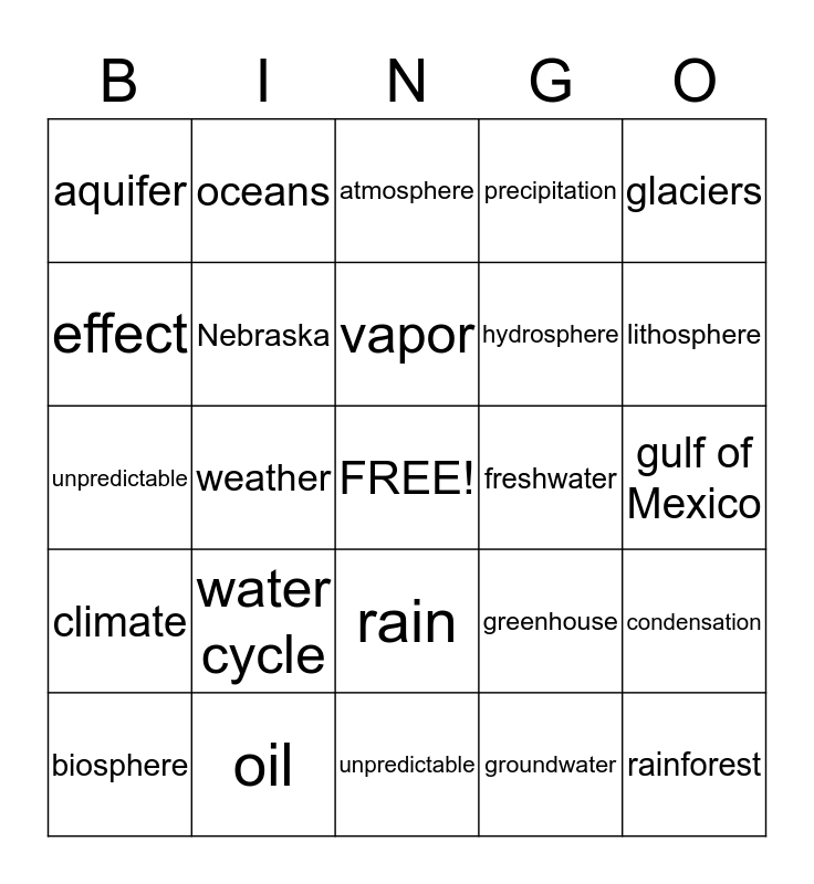 This bingo card has a free space and 24 words: water cycle, oil, vapor, biosphere, glaciers, aquifer, effect, oceans, freshwater, rain, hydrosphere, unpredictable, greenhouse, condensation, Nebraska, groundwater, gulf of Mexico, atmosphere, lithosphere, weather, rainforest, climate, precipitation and unpredictable.