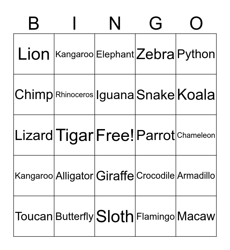 This bingo card has a free space and 29 words: Toucan, Monkey, Tigar, Gorilla, Lion, Elephant, Rhinoceros, Alligator, Parrot, Butterfly, Chameleon, Macaw, Sloth, Flamingo, Koala, Hippo, Giraffe, Kangaroo, Python, Lizard, Crocodile, Frog, Snake, Chimp, Zebra, Kangaroo, Armadillo, Iguana and Turtle.