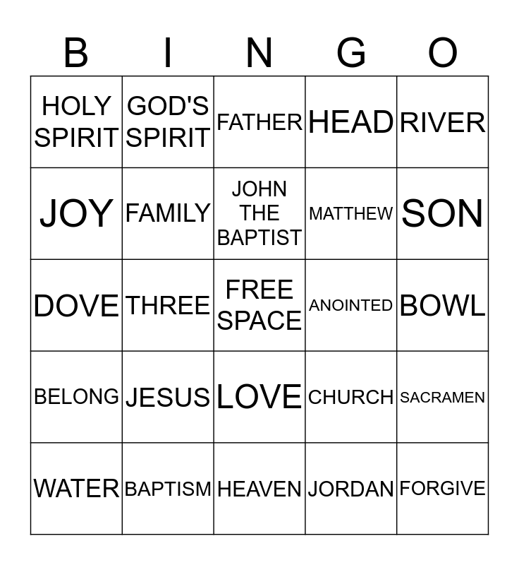 This bingo card has a free space and 24 words: JESUS, BAPTISM, JOHN THE BAPTIST, WATER, RIVER, HOLY SPIRIT, JOY, GOD'S SPIRIT, ANOINTED, LOVE, MATTHEW, DOVE, CHURCH, SACRAMEN, FAMILY, JORDAN, BOWL, FATHER, SON, THREE, FORGIVE, BELONG, HEAD and HEAVEN.