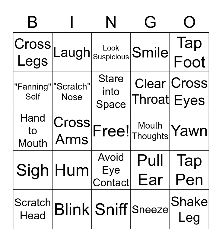 This bingo card has a free space and 29 words: Scratch Head, Crack Knuckles, Cross Arms, Tap Fingers, Cross Legs, Look Suspicious, "Scratch" Nose, Hum, Mouth Thoughts, Blink, Yawn, Shake Leg, Sniff, Sneeze, Cross Eyes, Lick Lips, Avoid Eye Contact, Sigh, Tap Foot, Hand to Mouth, Pull Ear, Adjust Kneck, Clear Throat, "Fanning" Self, Smile, Laugh, Tap Pen, Stare into Space and Fidget.