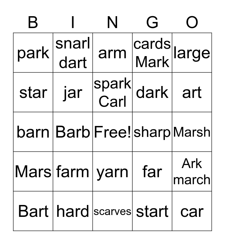 This bingo card has a free space and 29 words: Bart, smart, Barb, yard, park, arm, jar, farm, sharp, hard, Marsh, car, scarves, start, art, harm, yarn, Mars, large, barn, far, chart, dark, star, cards Mark, snarl dart, Ark march, spark Carl and charm shark.