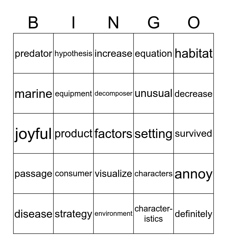 This bingo card has 25 words: consumer, environment, decomposer, disease, habitat, predator, marine, hypothesis, setting, visualize, unusual, joyful, characters, annoy, equipment, definitely, survived, increase, decrease, product, factors, strategy, passage, equation and character- istics.