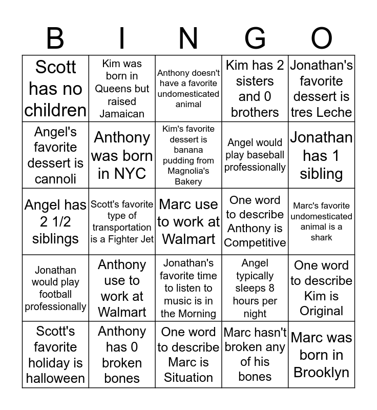 This bingo card has a free space and 29 words: Scott's favorite holiday is halloween, If Scott coud pick a professional sport it would be surfing, Scott's favorite type of transportation is a Fighter Jet, Scott's last meal choice - Del Manico 90 day dry aged ribeye. Meduim. Papi van Winkle 50 year, neat before the meal, Bottle of Opus 1 cabernet during. Cigar and Don Julio 1942 for dessert, Scott has no children, Anthony doesn't have a favorite undomesticated animal, Anthony was born in NYC, Anthony use to work at Walmart, One word to describe Anthony is Competitive, Anthony has 0 broken bones, Marc's favorite undomesticated animal is a shark, Marc was born in Brooklyn, One word to describe Marc is Situation, Marc hasn't broken any of his bones, Jonathan has 1 sibling, Jonathan typically sleep 5-6 hours per night, Jonathan's favorite time to listen to music is in the Morning, Jonathan would play football professionally, Jonathan's favorite dessert is tres Leche, Angel has 2 1/2 siblings, Angel typically sleeps 8 hours per night, Angel's favorite time to listen to music is in the Morning, Angel would play baseball professionally, Angel's favorite dessert is cannoli, Kim has 2 sisters and 0 brothers, Kim was born in Queens but raised Jamaican, One word to describe Kim is Original, Kim's favorite dessert is banana pudding from Magnolia's Bakery and Kim would be a UFC fighter professionally.