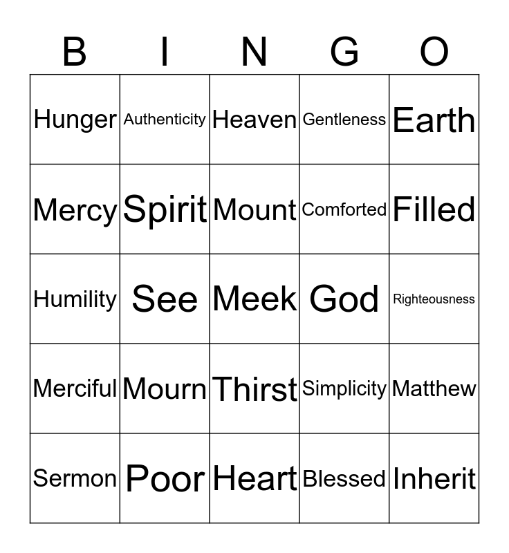 This bingo card has 30 words: Poor, Kingdom, See, Pure, Hunger, Heaven, Spirit, Thirst, God, Heart, Righteousness, Meek, Blessed, Inherit, Filled, Receive, Simplicity, Merciful, Mourn, Earth, Humility, Compassion, Authenticity, Comforted, Mercy, Gentleness, Matthew, Sermon, Mount and Beatitudes.