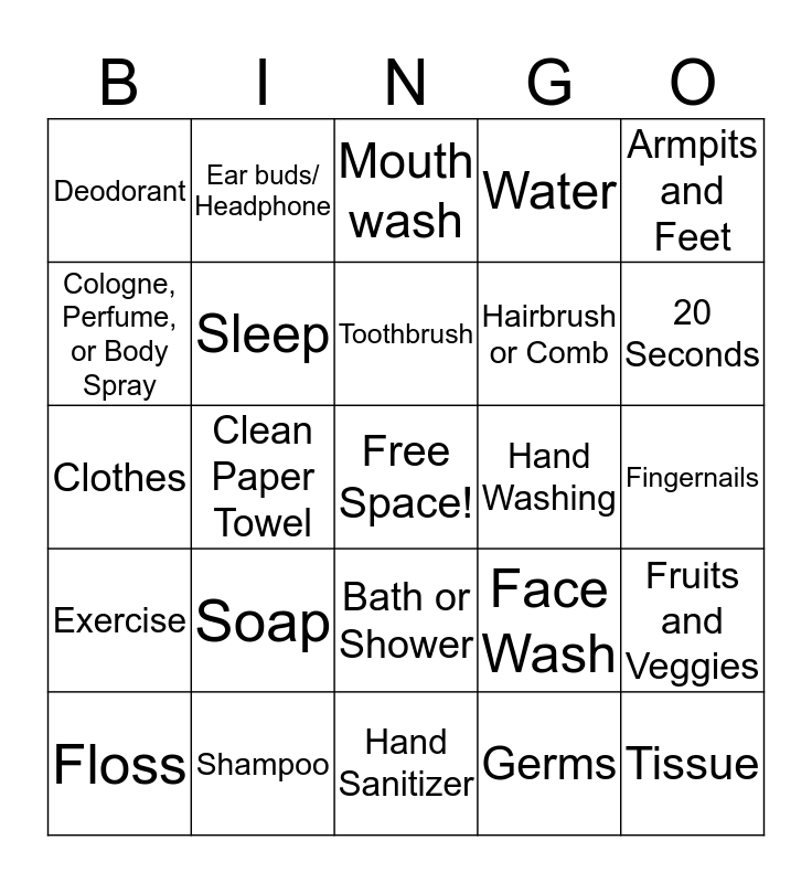 This bingo card has a free space and 24 words: Soap, Shampoo, Toothbrush, Floss, Armpits and Feet, Deodorant, Cologne, Perfume, or Body Spray, Ear buds/ Headphone, Hand Washing, Bath or Shower, Hairbrush or Comb, Clothes, Face Wash, Fruits and Veggies, Sleep, Germs, Fingernails, Mouth wash, 20 Seconds, Clean Paper Towel, Tissue, Exercise, Water and Hand Sanitizer.