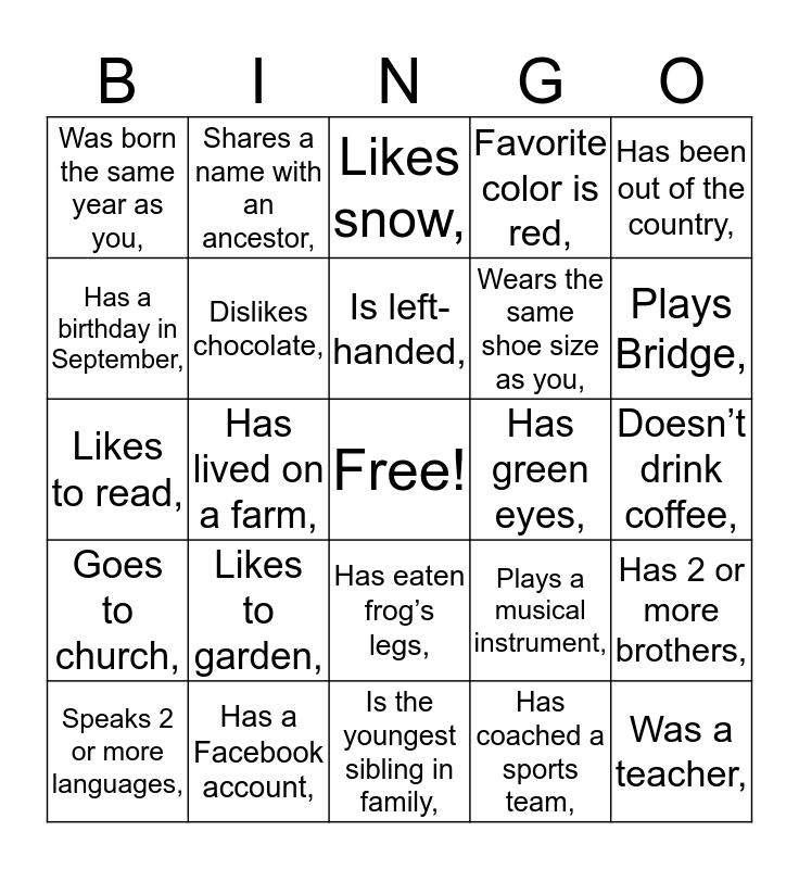 This bingo card has a free space and 25 words: Likes to garden,, Is the youngest sibling in family,, Is left-handed,, Speaks 2 or more languages,, Has been out of the country,, Was born the same year as you,, Has a birthday in September,, Shares a name with an ancestor,, Has green eyes,, Has eaten frog’s legs,, Wears the same shoe size as you,, Likes to read,, Plays a musical instrument,, Has 2 or more brothers,, Dislikes chocolate,, Was born in another country,, Doesn’t drink coffee,, Likes snow,, Plays Bridge,, Has lived on a farm,, Was a teacher,, Has a Facebook account,, Goes to church,, Favorite color is red, and Has coached a sports team,.