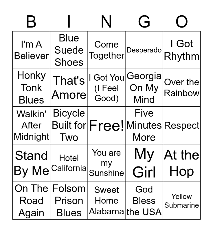 This bingo card has a free space and 24 words: Hotel California, Folsom Prison Blues, I Got You (I Feel Good), On The Road Again, I Got Rhythm, I'm A Believer, Honky Tonk Blues, Blue Suede Shoes, Five Minutes More, You are my Sunshine, Georgia On My Mind, Walkin' After Midnight, My Girl, At the Hop, That's Amore, God Bless the USA, Respect, Come Together, Over the Rainbow, Bicycle Built for Two, Yellow Submarine, Stand By Me, Desperado and Sweet Home Alabama.