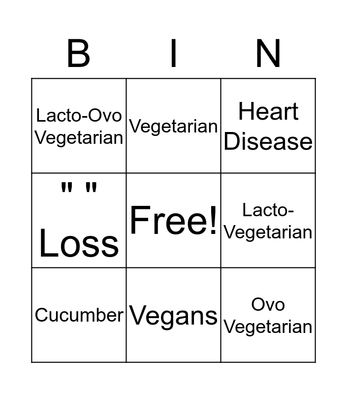 This bingo card has a free space and 13 words: Pescetarian, Pollo-vegetarian, Cucumber, Vegetarian, " " Loss, Ovo Vegetarian, Tomato, 25%, Vegans, Lacto-Ovo Vegetarian, Lacto-Vegetarian, Heart Disease and " " Levels.