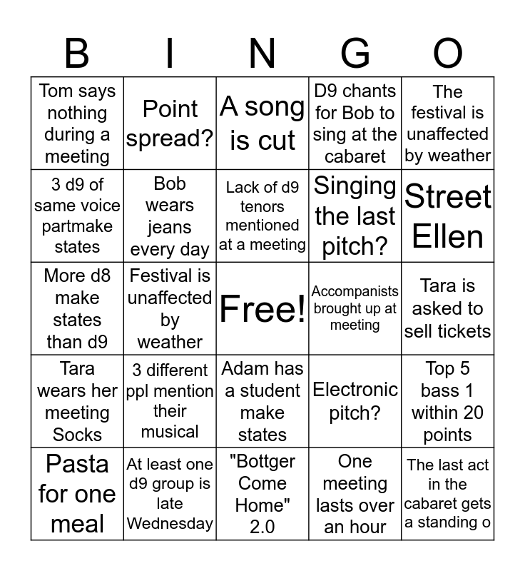 This bingo card has a free space and 24 words: 3 different ppl mention their musical, At least one d9 group is late Wednesday, Lack of d9 tenors mentioned at a meeting, Pasta for one meal, The festival is unaffected by weather, Tom says nothing during a meeting, 3 d9 of same voice partmake states, Point spread?, Accompanists brought up at meeting, Adam has a student make states, Singing the last pitch?, More d8 make states than d9, Electronic pitch?, Top 5 bass 1 within 20 points, Bob wears jeans every day, One meeting lasts over an hour, Tara is asked to sell tickets, A song is cut, Street Ellen, Festival is unaffected by weather, The last act in the cabaret gets a standing o, Tara wears her meeting Socks, D9 chants for Bob to sing at the cabaret and "Bottger Come Home" 2.0.