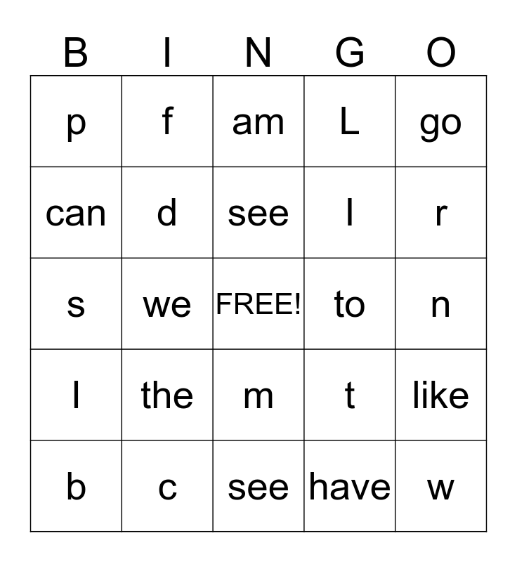 This bingo card has a free space and 24 words: the, c, see, b, go, p, can, f, to, m, I, s, t, like, d, have, n, am, r, we, w, I, L and see.