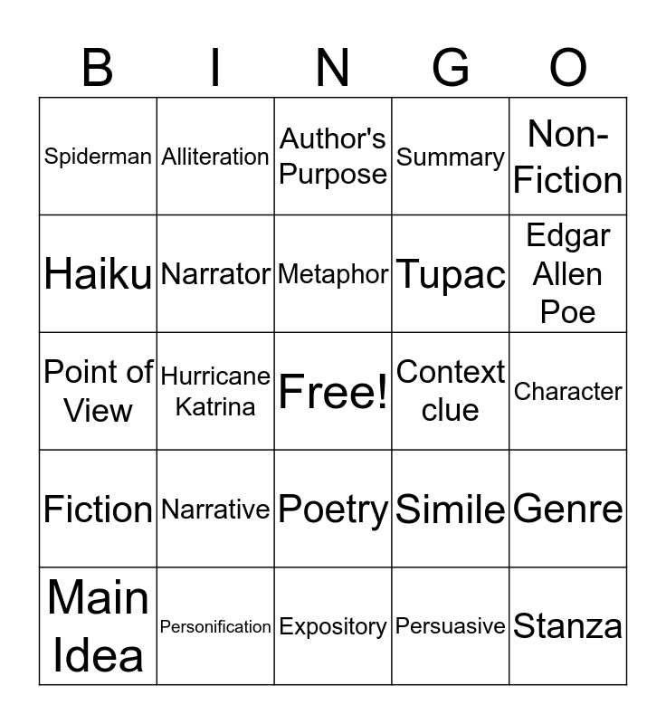 This bingo card has a free space and 24 words: Narrative, Personification, Metaphor, Main Idea, Non-Fiction, Spiderman, Haiku, Alliteration, Context clue, Poetry, Tupac, Point of View, Simile, Genre, Narrator, Persuasive, Character, Author's Purpose, Edgar Allen Poe, Hurricane Katrina, Stanza, Fiction, Summary and Expository.