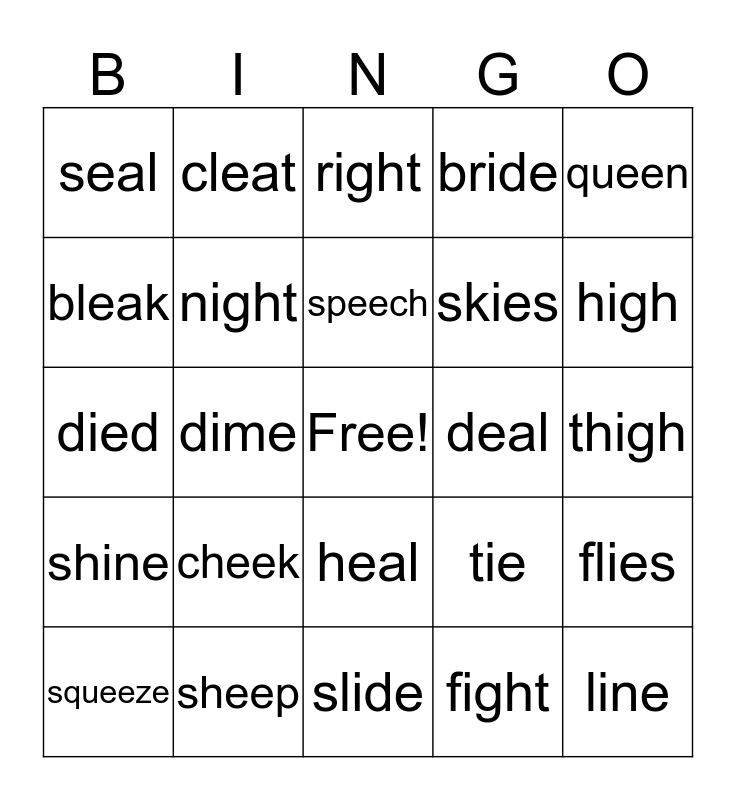 This bingo card has a free space and 24 words: cheek, sheep, speech, squeeze, queen, seal, bleak, cleat, deal, heal, skies, died, tie, flies, night, fight, thigh, right, high, dime, line, shine, bride and slide.