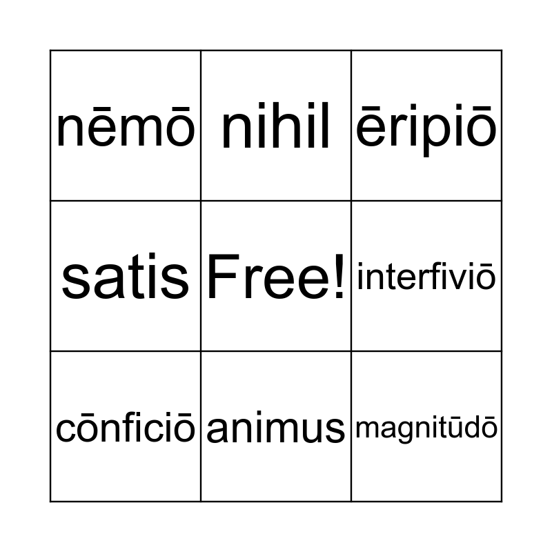 This bingo card has a free space and 8 words: interfiviō, ēripiō, nihil, cōnficiō, nēmō, magnitūdō, satis and animus.