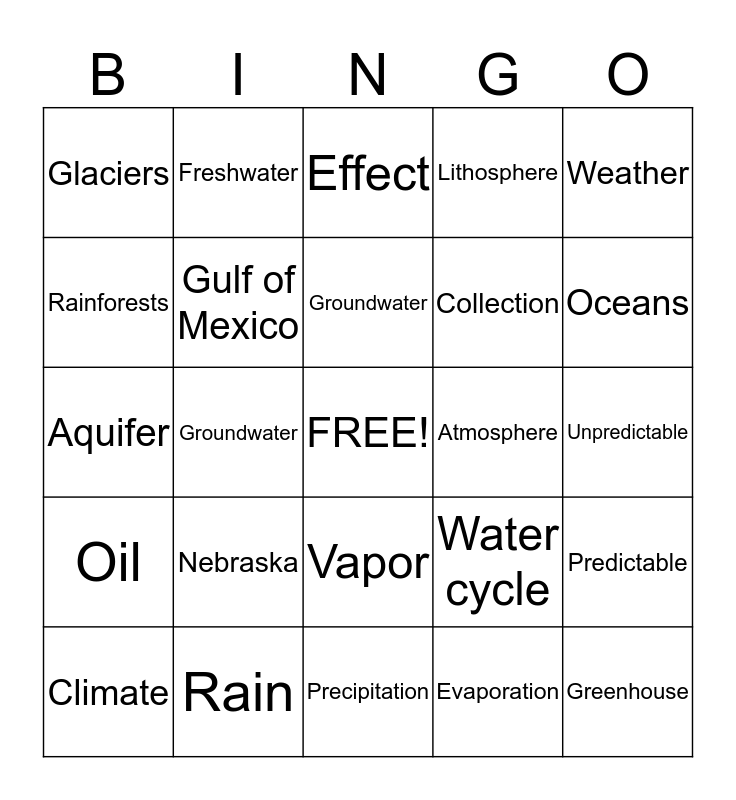 This bingo card has a free space and 24 words: Nebraska, Rain, Groundwater, Climate, Weather, Glaciers, Rainforests, Freshwater, Atmosphere, Vapor, Collection, Aquifer, Water cycle, Predictable, Gulf of Mexico, Evaporation, Unpredictable, Effect, Oceans, Groundwater, Greenhouse, Oil, Lithosphere and Precipitation.