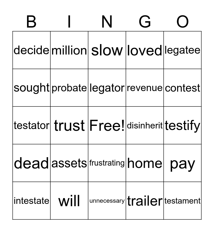 This bingo card has a free space and 29 words: lawyer, will, slow, smart, legatee, decide, probate, legator, disinherit, pay, intestate, trust, trailer, testament, testator, client, unnecessary, home, contest, dead, assets, hard, revenue, testify, sought, million, frustrating, loved and habit.
