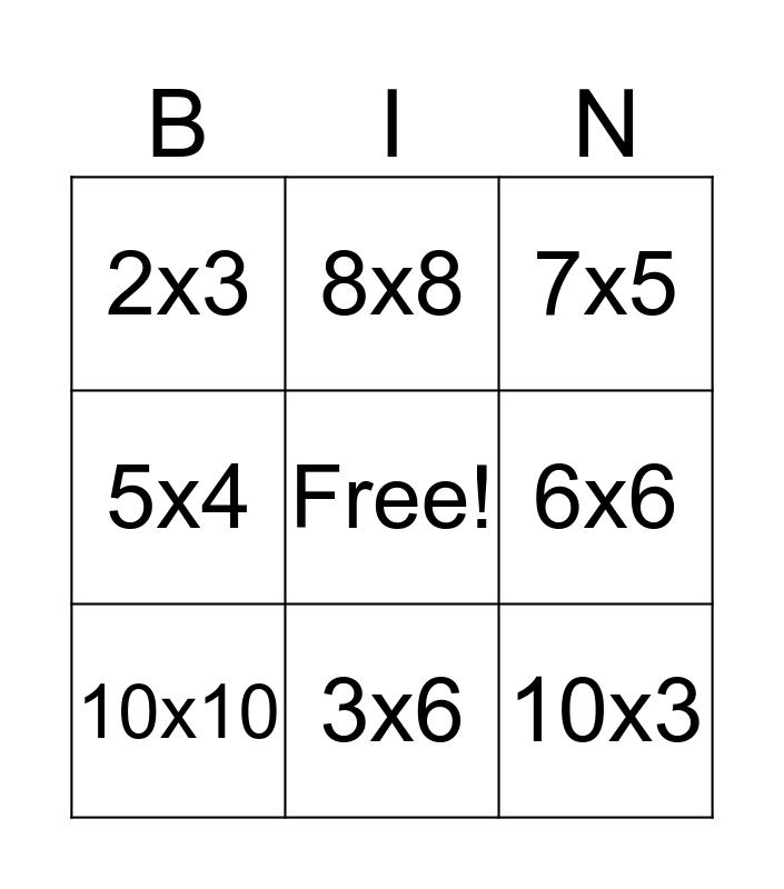 This bingo card has a free space and 8 words: 6x6, 7x5, 8x8, 10x10, 2x3, 10x3, 5x4 and 3x6.