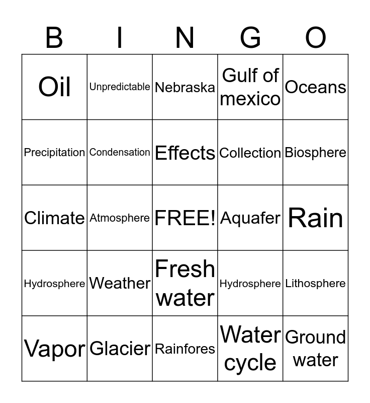 This bingo card has a free space and 24 words: Weather, Glacier, Effects, Vapor, Oceans, Oil, Precipitation, Unpredictable, Aquafer, Fresh water, Collection, Climate, Hydrosphere, Lithosphere, Condensation, Water cycle, Rain, Nebraska, Biosphere, Atmosphere, Ground water, Hydrosphere, Gulf of mexico and Rainfores.