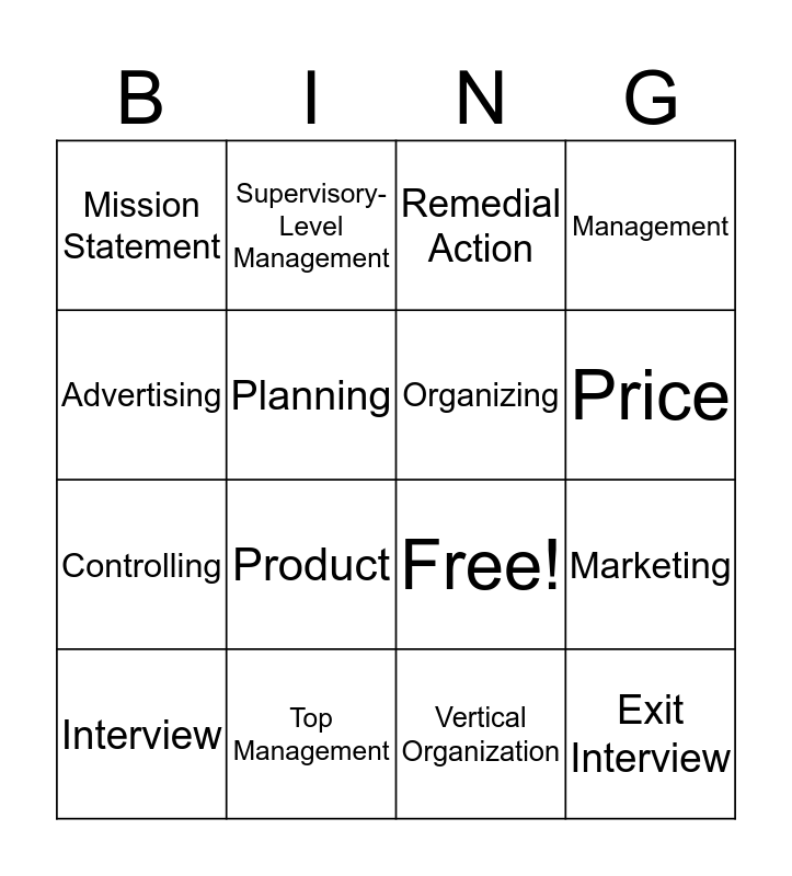 This bingo card has 22 words: Top Management, Middle Management, Supervisory-Level Management, Empowerment, Planning, Organizing, Mission Statement, Remedial Action, Free!, Exit Interview, Controlling, Management, Horizontal Organization, False, Vertical Organization, True, Marketing, Interview, Product, Advertising, Price and Promotion.