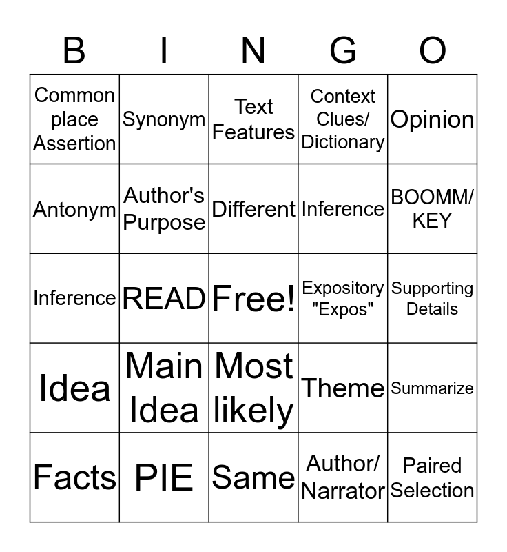 This bingo card has a free space and 25 words: Main Idea, Same, Different, Facts, Opinion, Common place Assertion, Antonym, Synonym, Expository "Expos", Most likely, Inference, Inference, Theme, Summarize, Author's Purpose, 5 Text Structures DCCPS, Supporting Details, Text Features, BOOMM/ KEY, READ, Paired Selection, PIE, Idea, Context Clues/ Dictionary and Author/ Narrator.