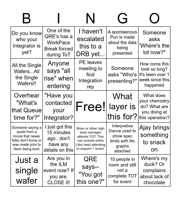 This bingo card has a free space and 29 words: Just a single wafer, Overhear--"I feel this should be low risk", "Have you contacted your Integrator?, ", Do you know who your Integrator is yet?, I haven't escalated this to a DRB yet..., Anyone says "all rise" when entering, I just got this 15 minutes ago.. don't have any details on this, What layer is this for?, Are you in the ILM event now? If you are, CLOSE it!, What does your chemistry do? What are you doing at this operation?, Where's my duck? Or complains about lack of chocolate, QRE says--"You got this one?", 10 people in room and still not a complete TOT for event, How come this took so long? It's been over 1 week since this happened, "Bobby, can you go down 1 slide?", Brian or other high level manager attends TOT. This can include entire Litho dept attending to support 1 event., Someone saying a quote from a movie that newer folks don't know or was made prior to them being born, Someone asks 'Where's the lot now?", Overhear "What's that Queue time for?", Interpretive Dance used to show spec limits with No graphs attached, Use of "estimated" drawings to show wafer breakage, Someone asks "Who's presenting?", All the Single Wafers...All the Single Wafers!!, A spontaenous Pun is made about the data being presented, One of the QRE's has a WorkPace Break forced during ToT, Ajay brings something to snack on, PE leaves meeting to find Integration rep and Somebody works in one of Andrea's TO3 responses from the list.