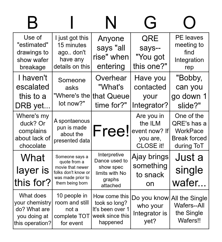 This bingo card has a free space and 28 words: Just a single wafer..., Overhear--"I feel this should be low risk", Have you contacted your Integrator?, Do you know who your Integrator is yet?, I haven't escalated this to a DRB yet..., Anyone says "all rise" when entering, I just got this 15 minutes ago.. don't have any details on this, What layer is this for?, Are you in the ILM event now? If you are, CLOSE it!, What does your chemistry do? What are you doing at this operation?, Where's my duck? Or complains about lack of chocolate, QRE says--"You got this one?", 10 people in room and still not a complete TOT for event, How come this took so long? It's been over 1 week since this happened, "Bobby, can you go down 1 slide?", Brian or other high level manager attends TOT. This can include entire Litho dept attending to support 1 event., Someone says a quote from a movie that newer folks don't know or was made prior to them being born, Someone asks "Where's the lot now?", Overhear "What's that Queue time for?", Interpretive Dance used to show spec limits with No graphs attached, Use of "estimated" drawings to show wafer breakage, Someone asks "Who's presenting?", All the Single Wafers--All the Single Wafers!!, A spontaenous pun is made about the presented data, One of the QRE's has a WorkPace Break forced during ToT, Ajay brings something to snack on, PE leaves meeting to find Integration rep and Somebody works in one of Andrea's TO3 responses from the list.