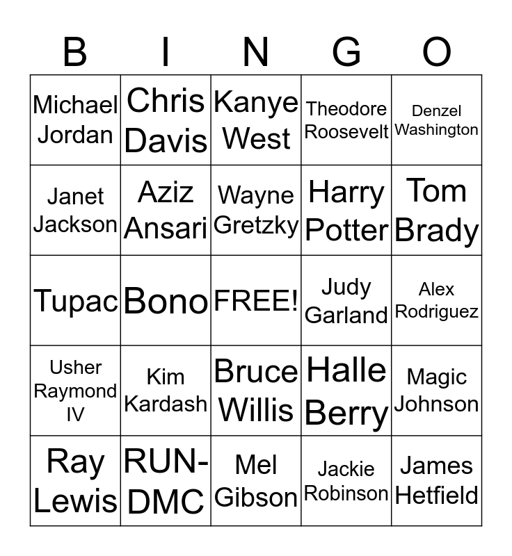 This bingo card has a free space and 24 words: Kim Kardash, RUN-DMC, Wayne Gretzky, Ray Lewis, Denzel Washington, Michael Jordan, Janet Jackson, Chris Davis, Judy Garland, Bruce Willis, Harry Potter, Tupac, Halle Berry, Magic Johnson, Aziz Ansari, Jackie Robinson, Alex Rodriguez, Kanye West, Tom Brady, Bono, James Hetfield, Usher Raymond IV, Theodore Roosevelt and Mel Gibson.