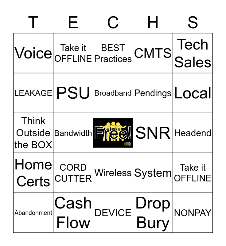 This bingo card has a free space and 49 words: DISCO, NONPAY, Let's CIRCLE Back, DEVICE, CORD CUTTER, CABLE, Take it OFFLINE, Shrinkage, LEAKAGE, DOCSIS, PSU, CMTS, Take it OFFLINE, System, OTT, Video, Broadband, SNR, Churn, Tech Sales, Bandwidth, Drop Bury, Voice, Pendings, Days Out, Local, Abandonment, Chamber, Wireless, Home Certs, Performance, Truck Roll, Outage, Install, Cash Flow, Revenue, Power Supply, Low Hanging Fruit, Headend, Game Changing, No Brainer, SYNC UP, On my Radar, On the Same Page, Think Outside the BOX, BEST Practices, ROBUST, Move the NEEDLE and STREAM.