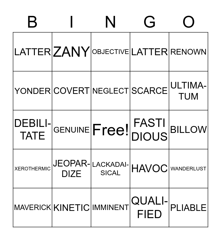 This bingo card has a free space and 29 words: ABRASIVE, KINETIC, OBJECTIVE, ENHANCE, RENOWN, LATTER, COVERT, NEGLECT, FASTI DIOUS, WANDERLUST, MAVERICK, GENUINE, QUALI- FIED, PLIABLE, DEBILI- TATE, TANGIBLE, IMMINENT, HAVOC, ULTIMA- TUM, XEROTHERMIC, JEOPAR- DIZE, VAGUE, SCARCE, BILLOW, YONDER, ZANY, LACKADAI-SICAL, LATTER and WANE.