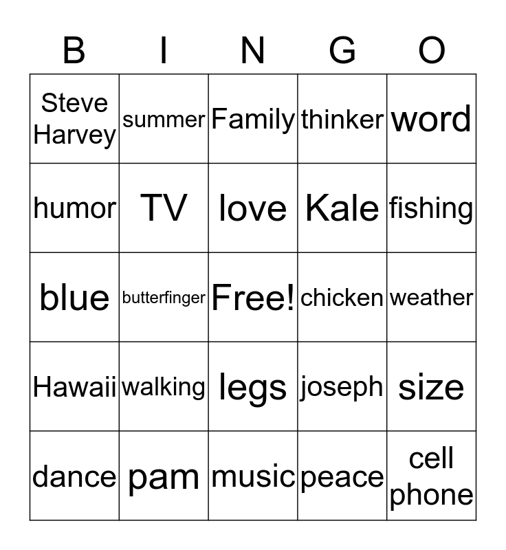 This bingo card has a free space and 64 words: Peace, steak, Pam, size, number, TV, summer, Joseph, love, heart, legs, swim, weather, word, mercedes, humor, butterfinger, Steve Harvey, Happy, Kale, walking, Hawaii, thinker, best friend, Ministry, ox tail, Business Calls, work, greeter, vision, humor, Hawaii, chocolate cake, heaven, fishing, dance, kale, peace, west virgina, TV, blue, chicken, summer, vision, butterfinger, cell phone, pam, weather, joseph, love, patience, clothes, music, communication, Pam, kids, Family, houses, helper, Convalesce, hospital, no soda, health and GOD.