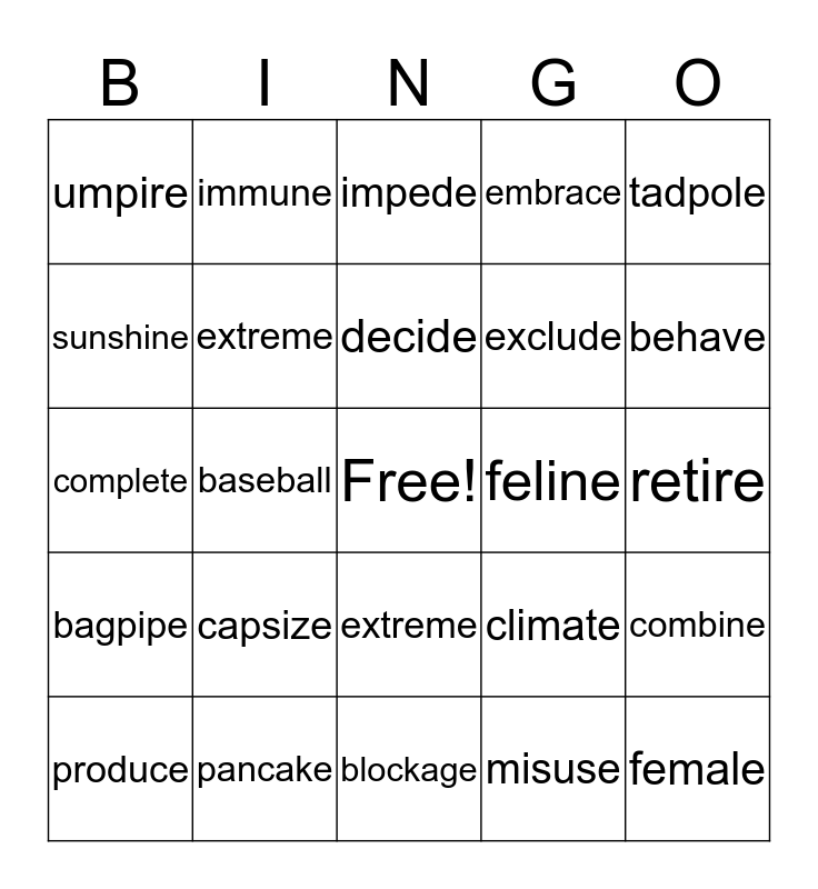 This bingo card has a free space and 24 words: capsize, pancake, decide, produce, tadpole, umpire, sunshine, immune, feline, extreme, exclude, complete, climate, combine, extreme, misuse, retire, impede, behave, baseball, female, bagpipe, embrace and blockage.