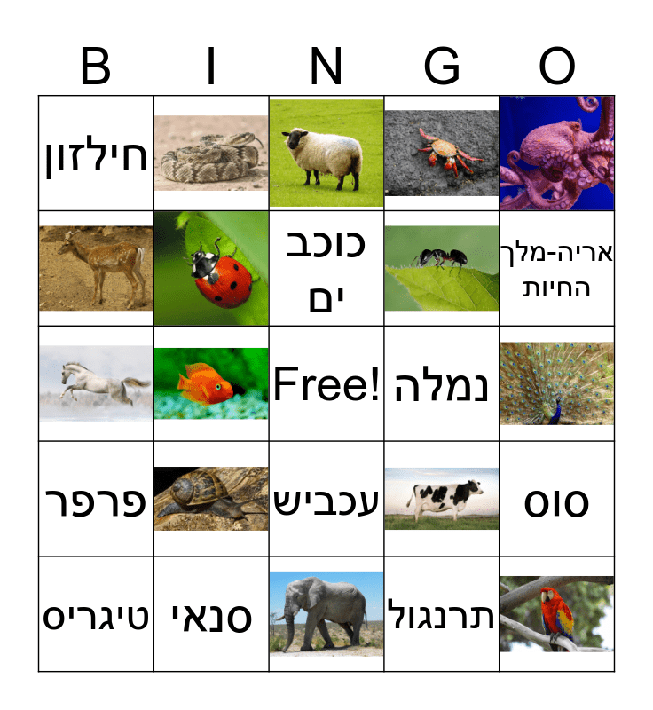 This bingo card has 29 images, a free space and 29 words: טיגריס, חתול, עז, פרה, תוכי, פרפר, חיפושית, קוקיה, נמלה, אריה-מלך החיות, אילה, סנאי, עכביש, כלב, חמור, נחש, פיל, סרטן, תרנגול, סוס, דג, כבשה, נשר, טוס, צב, חילזון, קוף, כוכב ים and תמנון.