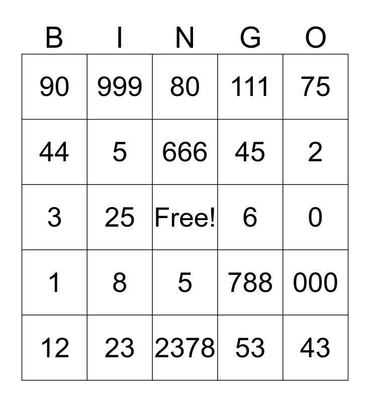 This bingo card has a free space and 29 words: 12, 4, 25, 73, 90, 80, 5, 8, 6, 23, 0, 43, 2378, 53, 2, 2, 5, 1, 75, 3, 788, 3, 45, 44, 111, 999, 000, 666 and 222.
